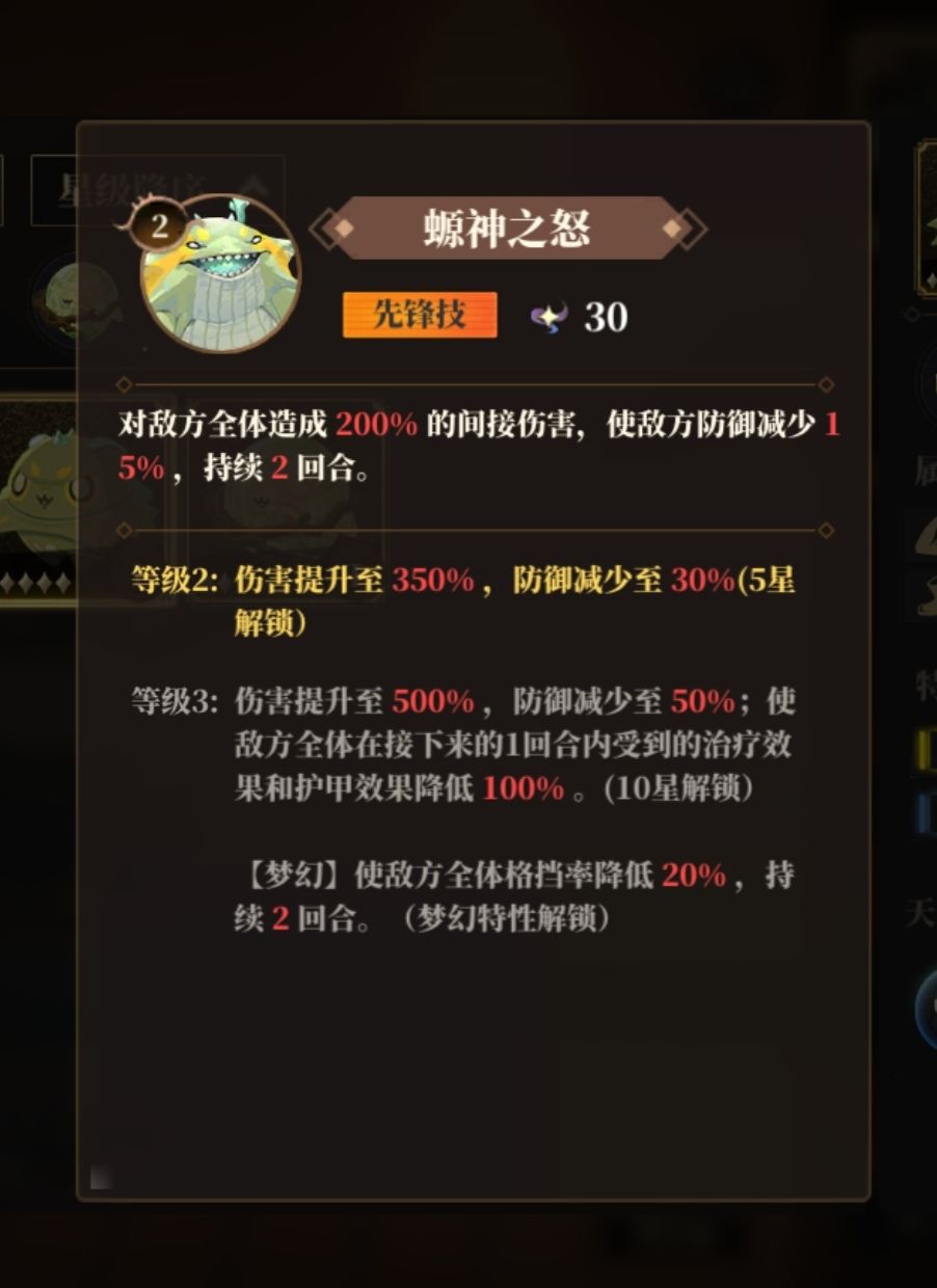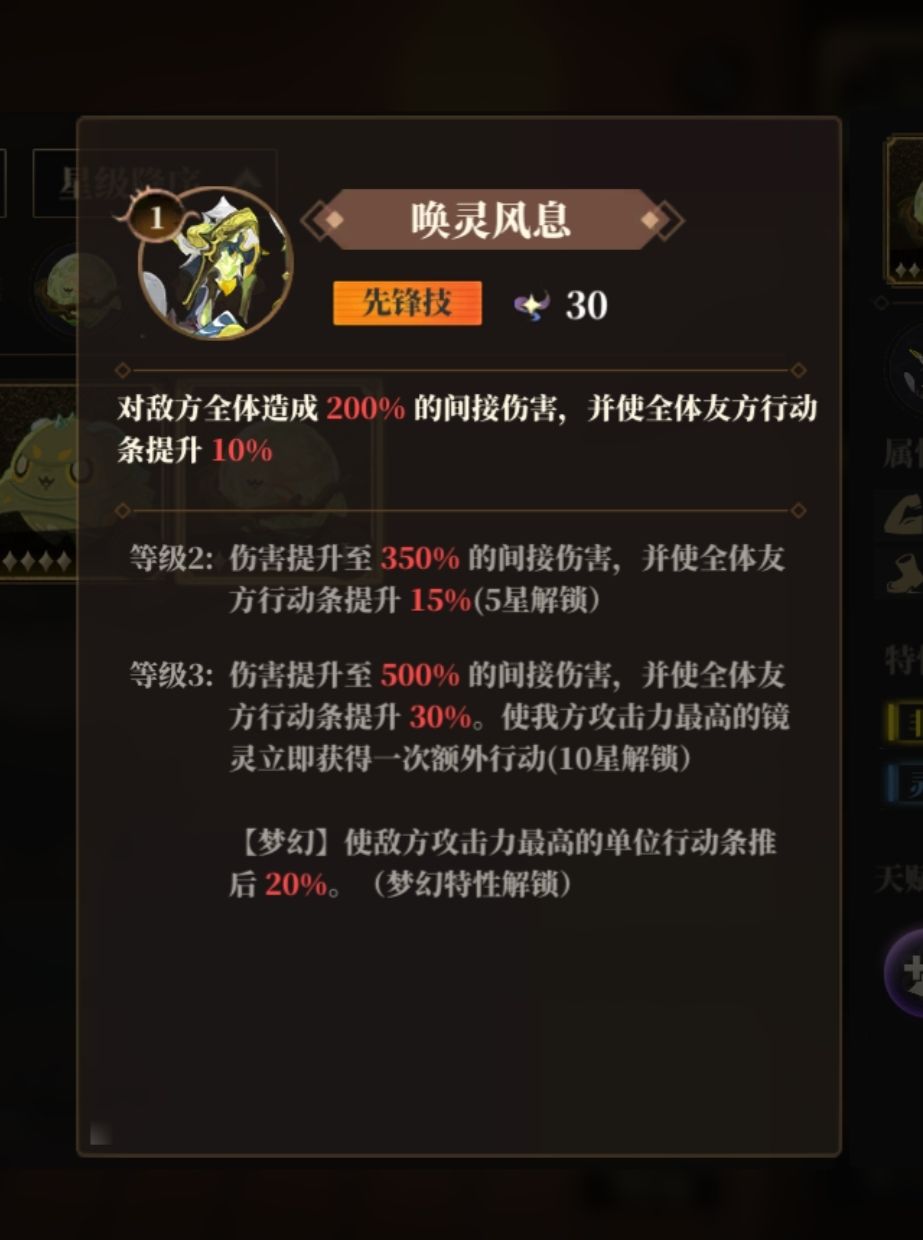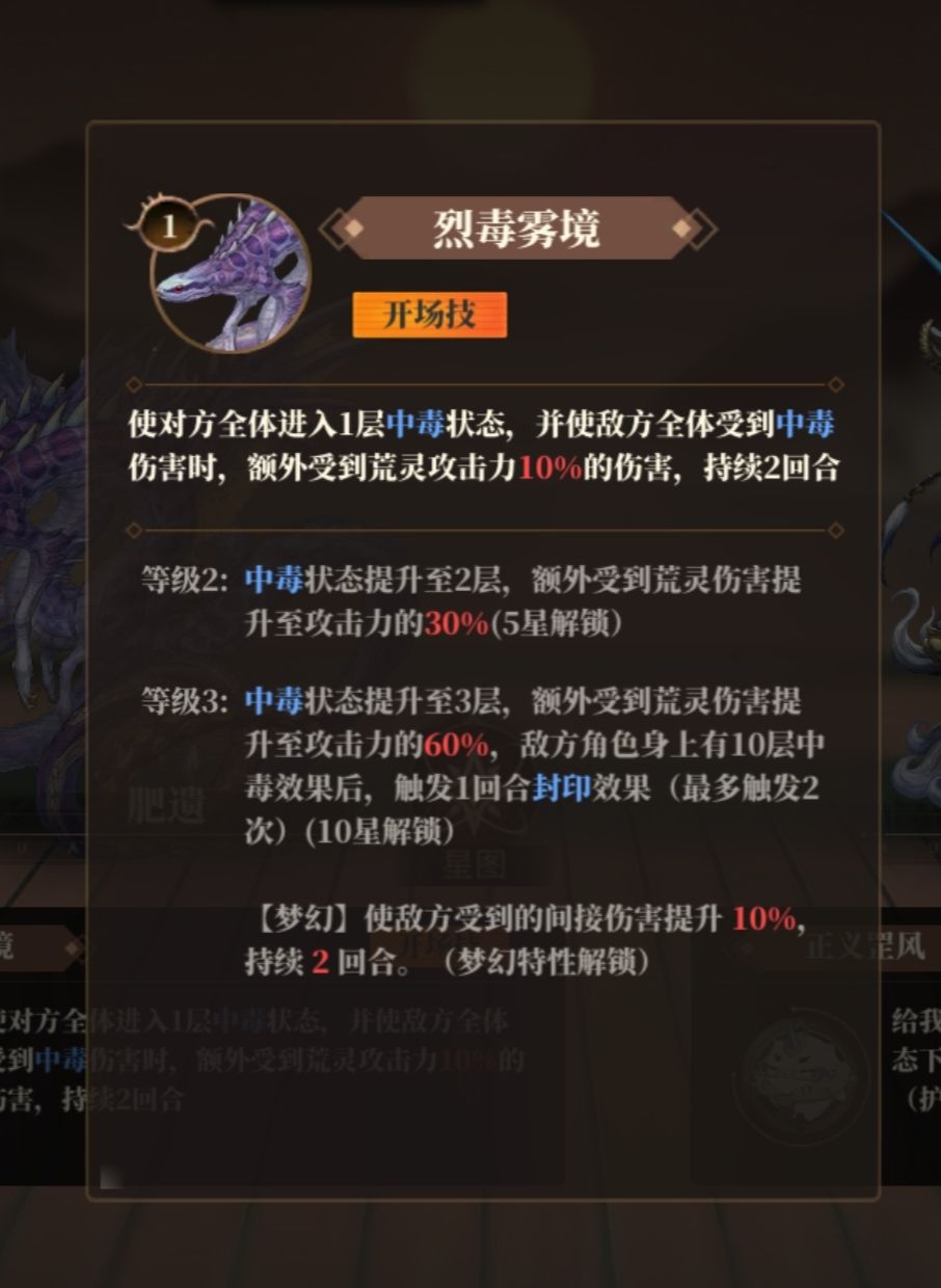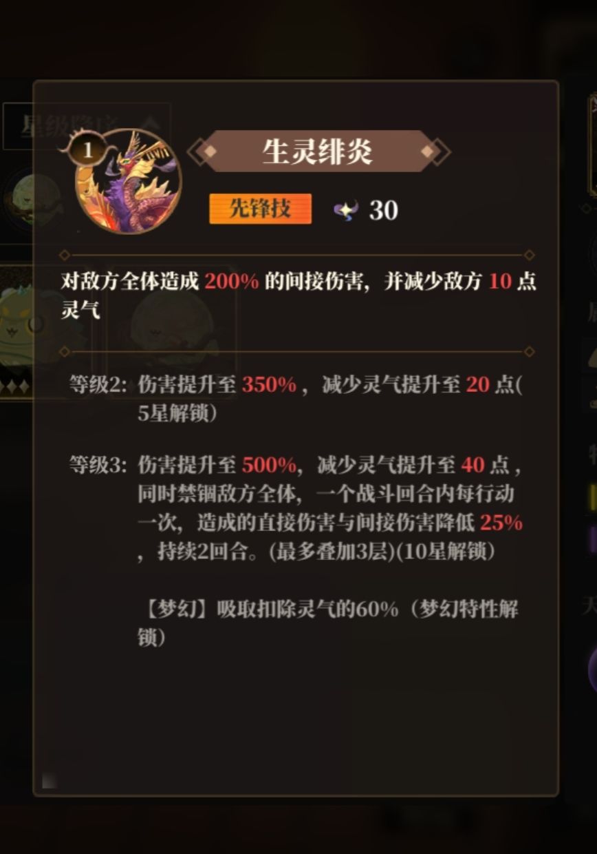 还有两个词条比较特殊分别是梦幻、天资聪颖;这两个都是顶级词条,有梦幻词条的荒灵上阵时能解锁该荒灵技的梦幻效果,有天资聪颖词条的荒灵在升星时能有更大概率获得金色天赋,可以继承给同种族荒灵,是非常好的刷天赋的炉鼎。