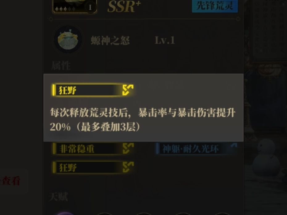 荒灵的基础词条,SSR品质单金词条必为该词条,但是对于强度的影响是较小的;荒灵有三围属性气力,智慧,灵敏;气力会对荒灵攻击力加成,灵敏会对荒灵暴击爆伤加成,智慧会影响初始元灵值和先手值(先手值决定开场技释放顺序,绝大部分情况下先放后放没有影响,除非是有先手释放开场技会加属性的特性词条),我在这里推荐优先级为智慧>气力>灵敏,最好的性格词条为非常多疑。