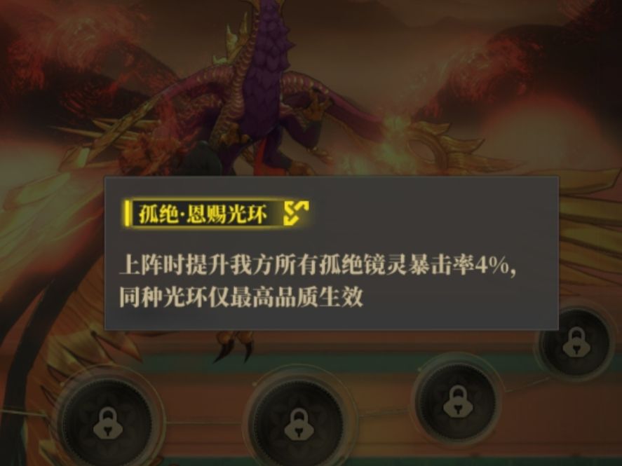 光环型属性加成,上场即可永久生效,可以对某一职业的镜灵的某项属性进行加成,相同词条无法叠加。推荐携带给输出增加暴击,爆伤,破强的光环