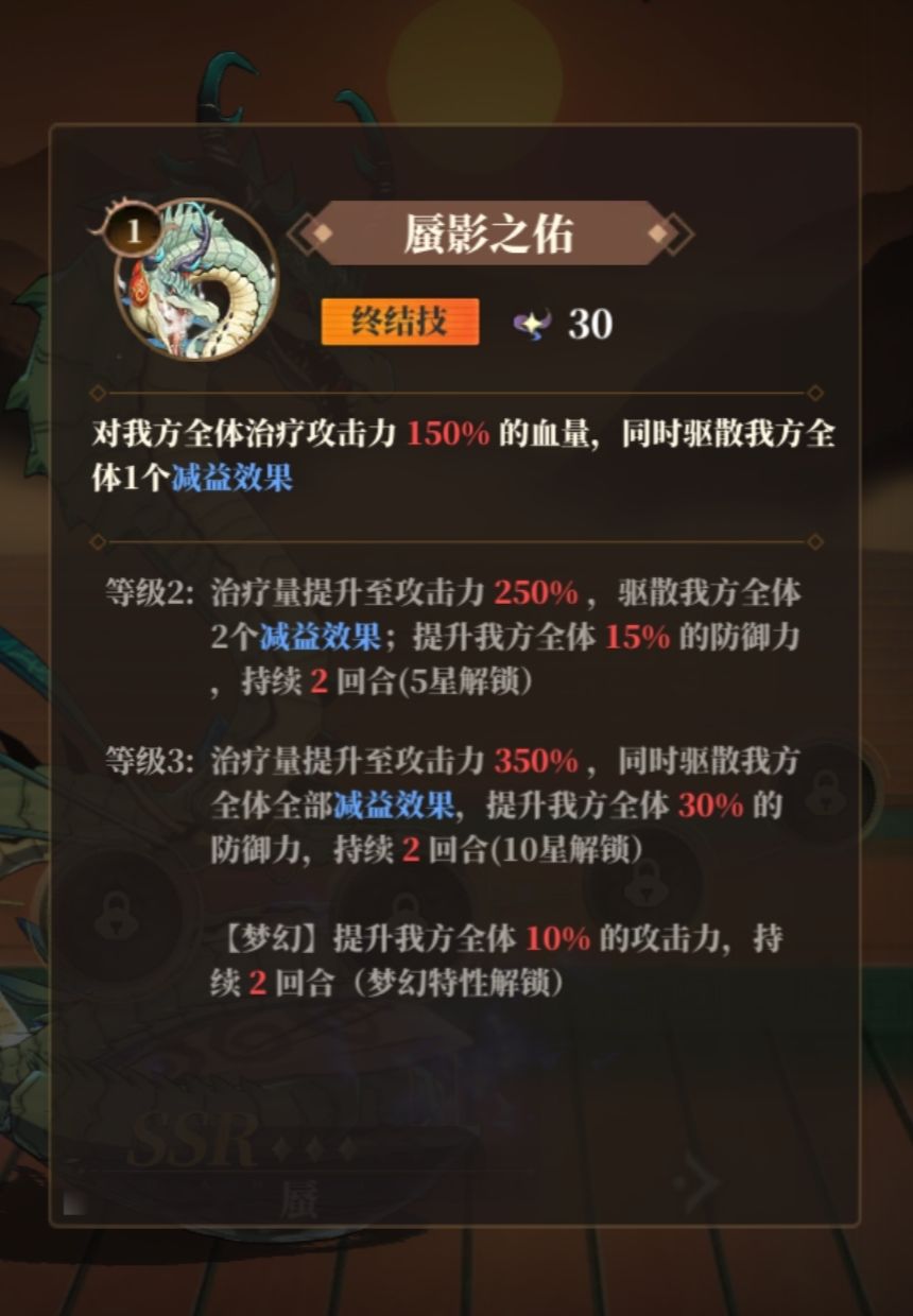 群体伤害+扣火40+降低输出75%,全方位限制敌方的输出能力,同时梦幻效果还会回复灵气,是所有梦幻效果中最实用的。