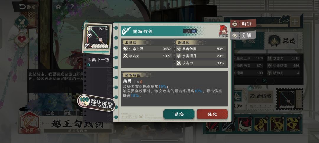 越王觉醒后爆伤=基础150+深造30+深造触发贯穿40+熊猫剑15+贯穿概率转化60+15+60-40=330