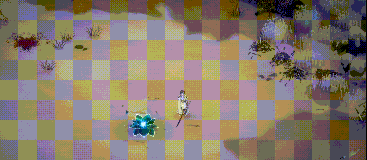 ②腾空下砸:高高跃起对角色所在位置造成范围伤害,有落点提示,落地后形成流沙效果,会被持续吸附限制玩家移动。