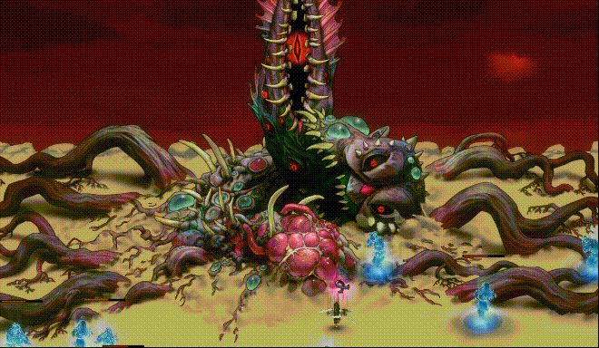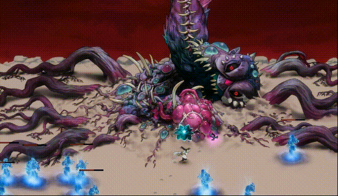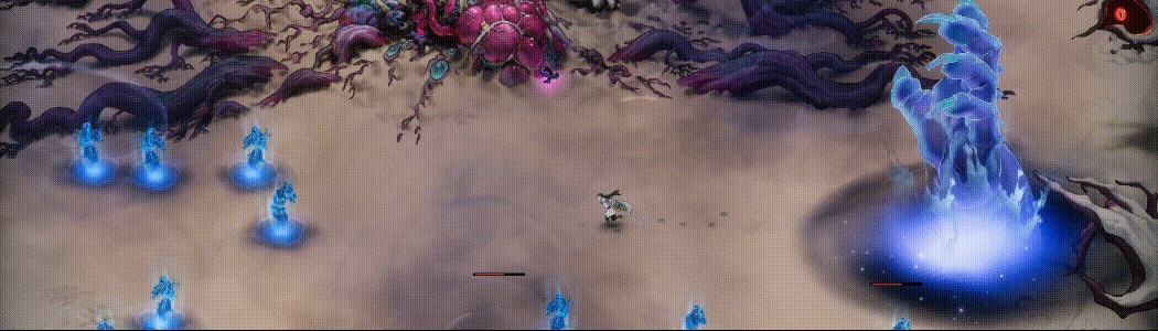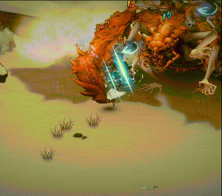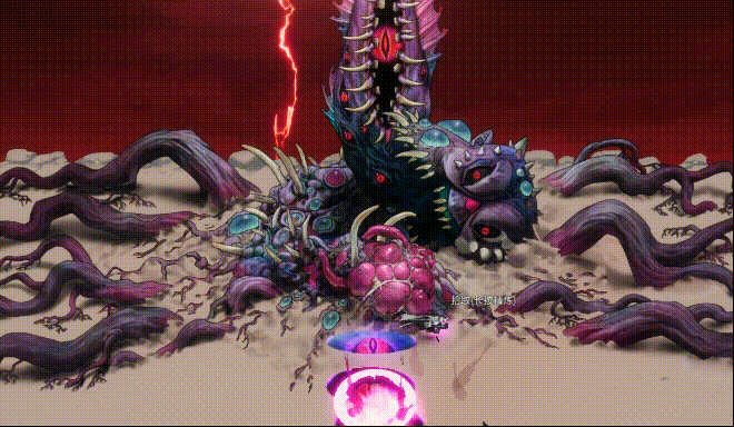 ④钻地攻击:BOSS钻入流沙中,有大范围的半屏伤害,速度较慢;地刺攻击,玩家所在位置从地底突出尖刺进行攻击。