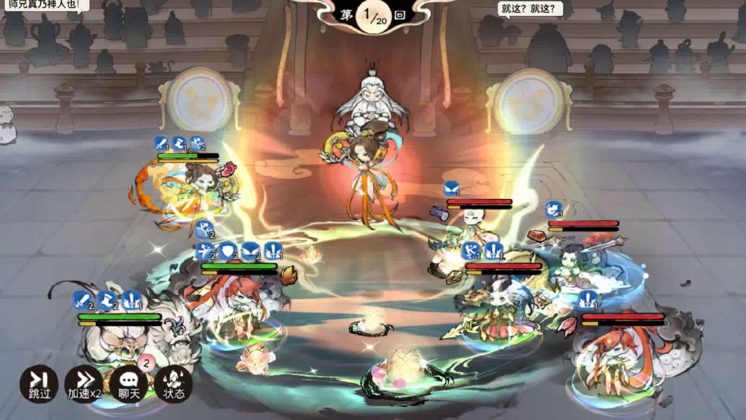 如果没有提前触发狡黠,即按照大荒→狂龙→普攻→普攻(狡黠)→笔刀的顺序(如视频所示),那么第一回合内可以完成2次普攻和1次法宝,并为队友添加上医师的红命丹心(2回合内回复+复活),效果是很不错的。