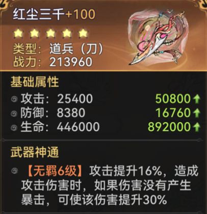 红尘三千加成未暴击的伤害,目前仅适用于土系的刀修玩家,携带红尘三千伤害略高于孤途道兵,但泛用性和性价比低于孤途,属于抽到不亏的类型。推荐指数:★★★