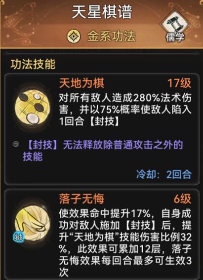 天星棋谱被动虽有叠伤机制,但缺乏无视穿透等特效,伤害水平中等,而其高概率全体封技、低回合(2cd)冷却的控制性非常突出,是一本不错的软控功法。推荐指数:★★★