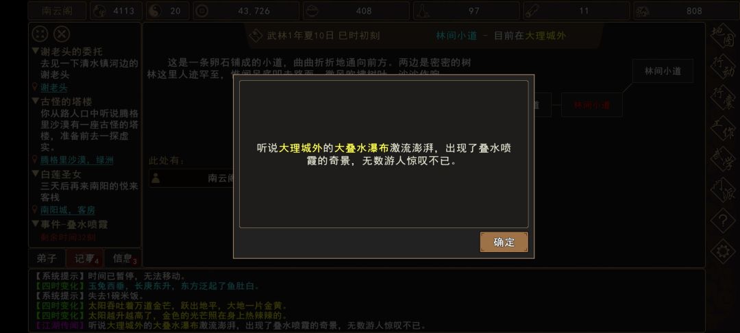 (1)前往 大理城外→大叠水瀑布,触发过场剧情,获得限时状态:[飞瀑感悟]。