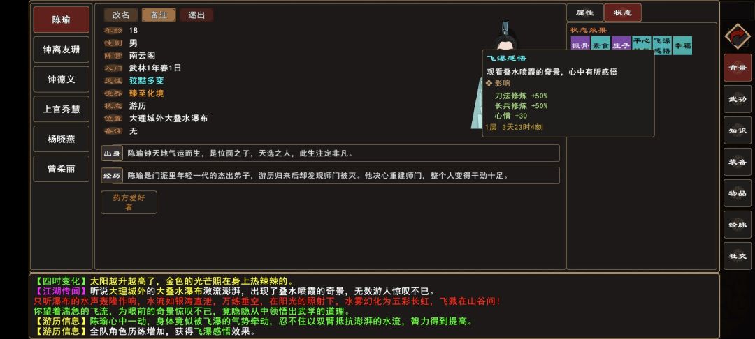 (1)前往 大理城外→大叠水瀑布,触发过场剧情,获得限时状态:[飞瀑感悟]。