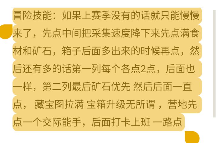 冒险技能:如果上赛季没有的话就只能慢慢来了,先点中间把采集速度降下来先点满食材和矿石,箱子后面多出来的时候再点,然后还有多的话第一列每个各点2点,后面也一样,第二列最后矿石优先 然后后面一直点, 藏宝图拉满 宝箱升级无所谓 ,营地先点一个交际能手,后面打卡上班 一路点