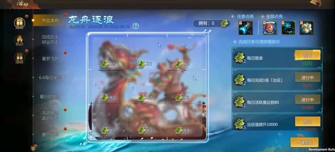 活动期间,完成每日、累计任务可获得拼图碎片,每解锁任意一块拼图都可获得月之匙(3天)*1!解锁所有拼图还可获得吕蒙-封灵玉*热血龙舟!机不可失,快快参与吧~
