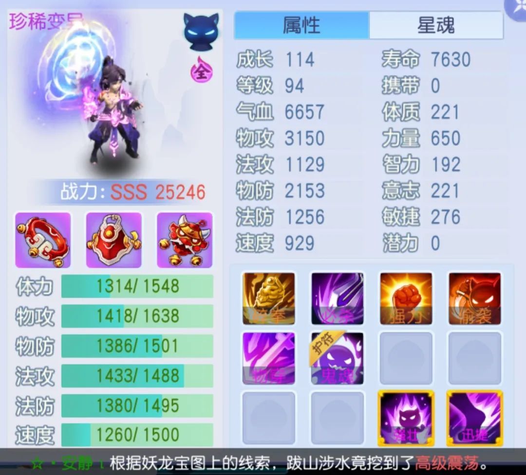 属性分配依旧力量为主。94级,3400+的物攻,近7000的气血和近900的速度,属性方面还有提高的空间。