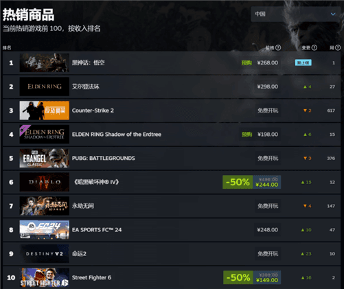 6月8日,《黑神话悟空》宣布在ps5,epic,steam,WeGame四平台发布预售,国区标准版定价268,豪华版定价328。游戏在登录steam后在热销榜迅速上升,目前已经到热销榜第一的位置。