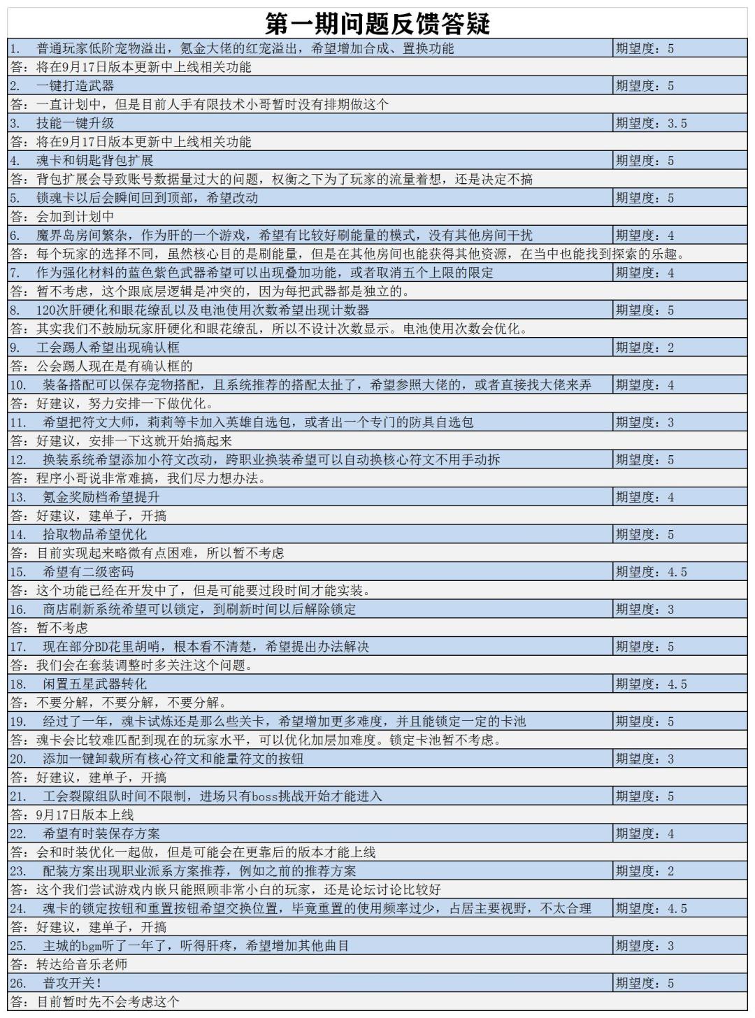 3、反馈的问题与建议不得与个人行为挂钩,例如开挂或者个人分解错武器等等,请直接反馈客服,这里反馈一星期整理一次综合上报,并没有办法实时处理。一星期整理一次,得到答复后会单独发帖,可以单独查看也可以在下一期的往期回顾中查看