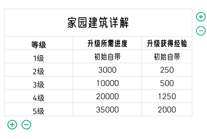 家园建筑共4个,分5个等级,开始为1级,后续升级所需要的建造进度分别为3000、10000、20000、35000,完成后获得的家园经验分别为250、500、1250、2000,家园经验在左上角查看,四个建筑升级所需要的进度和材料都一样。