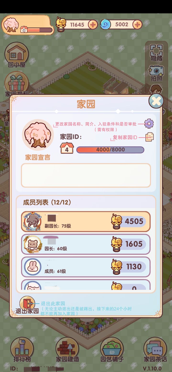 1.创立家园者为园长,园长可在左上角成员列表转让园长、另立副园长、踢出成员(副园长也能踢,但不能踢园长哈)