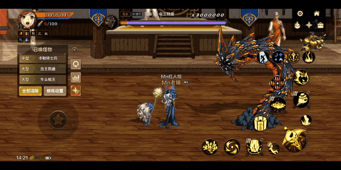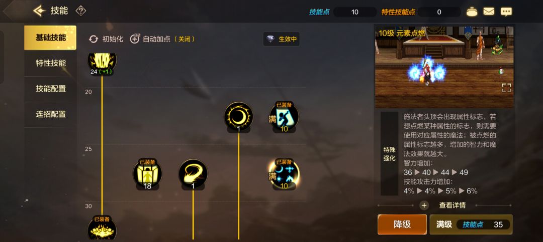 元素师的特性是元素点燃!因此需要在开局或进入BOSS场景前,使用4元素小技能,点燃后输出!因此设置4个小技能连招,这一点也是玩转元素师的必备技能!