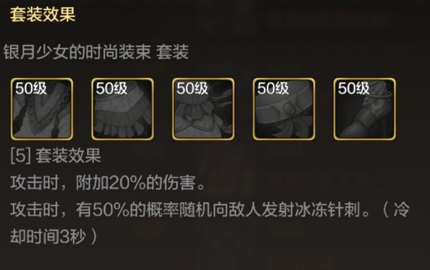 防具:前期优先散件,50级史诗装加伤害百分比的随意搭配即可!毕业套装为银月少女套装,(套装效果:20%伤害和50%概率发射冰冻针刺)