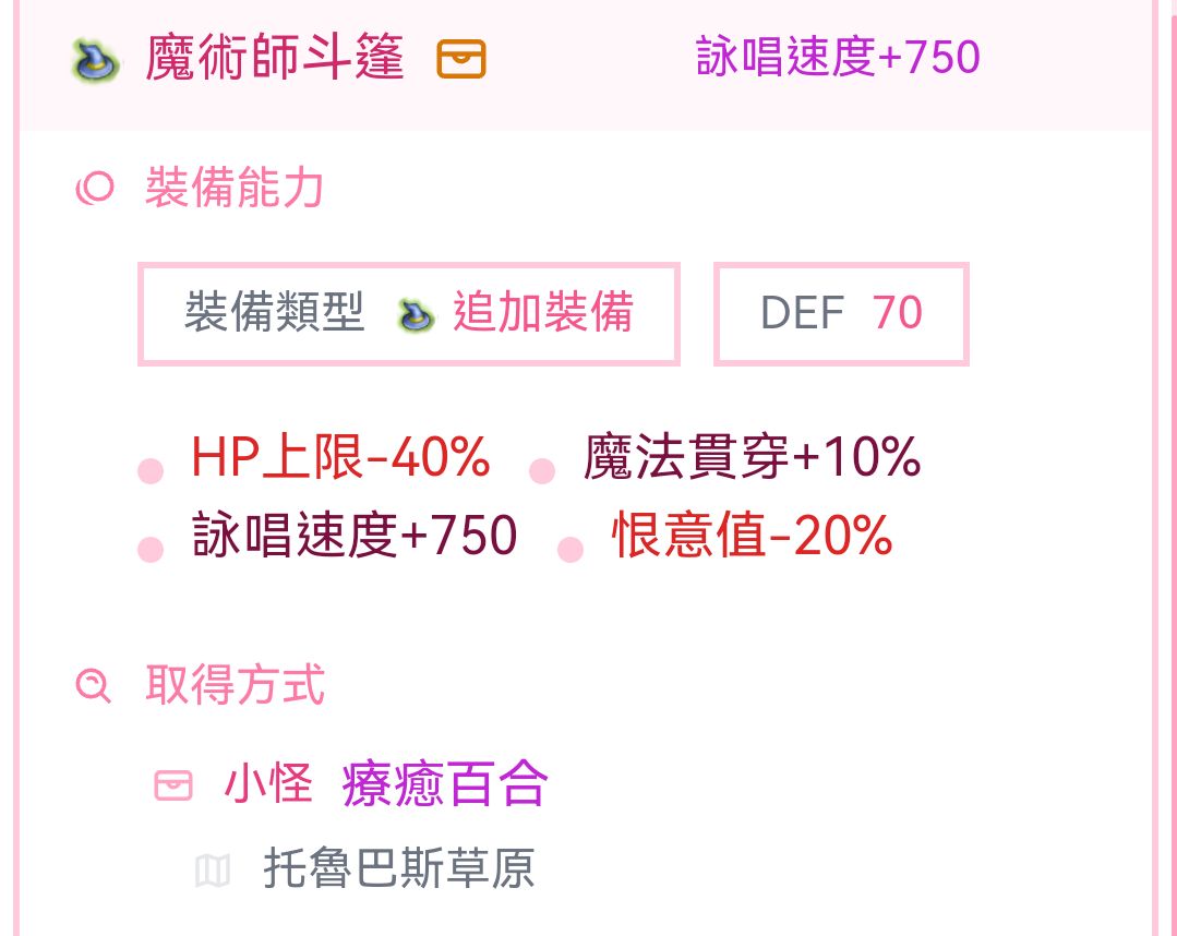 追加装备—魔术师斗篷:出处“艾因可兰”北部“托卢巴斯草原”小怪疗愈百合,刷个单孔