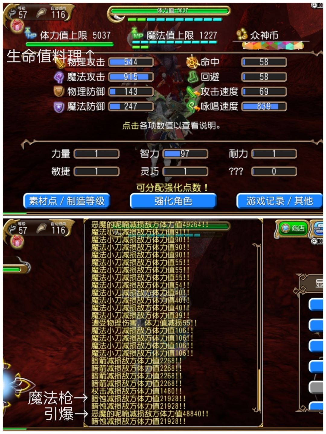 料理我只吃了一个生命值上限保证生存,随便吃个8~10级魔法值料理就2000魔法值,武器没有精炼,伤害还能更高。装备的孔镶嵌的是咏唱速度+120,出自洛可可废墟城的小怪嗡嗡