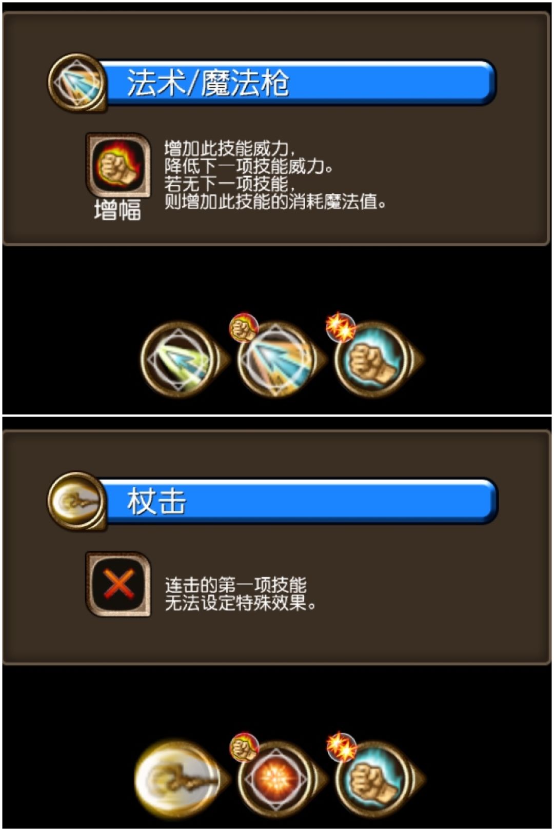 4、断连:通过设置可施放但不放的技能、或超出魔法值上限的技能在连击结尾,从而让连击增幅或补位后终止连击,白piao增幅、补位。上图中第三个技能[圣拳之裁]就是用作断连,因为它的射程仅1m,一般是放不出来的 ## 断连无法增加连击经验 ##