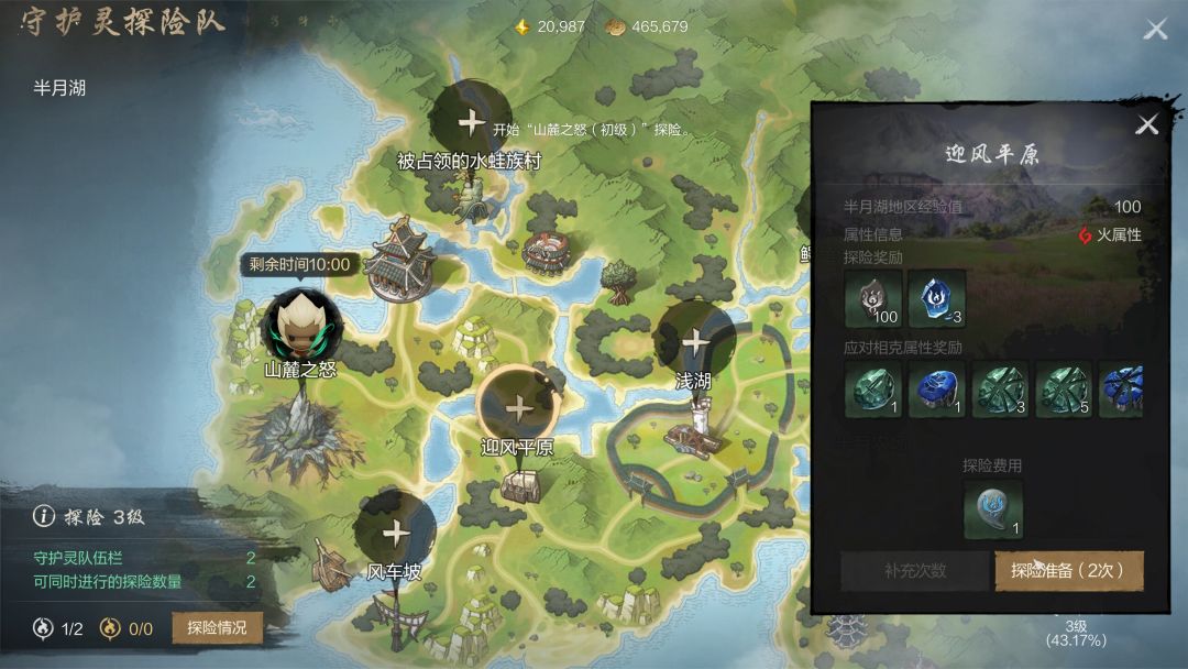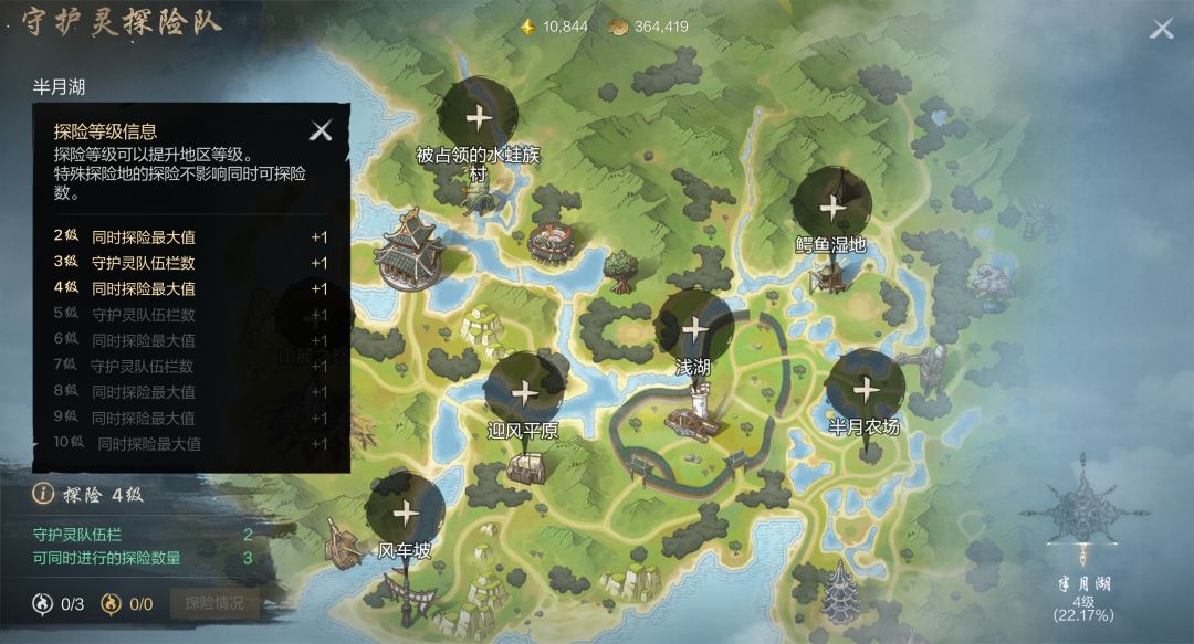 半月湖提供7个探险点,每个探险点都有初级、上级、至尊三个等级。