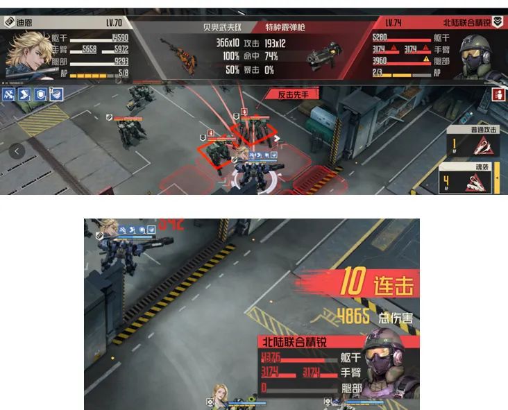 第一组测试我们用3个金3部位+1个彩部位的赫拉克勒斯来进行攻击,由于需要考虑到暴击的缘故,所以刚刚维一已经提到的简单的对比就是从武器攻击力上的对比,赫拉是366×10的攻击,其中一次测试打出的伤害为4865,。