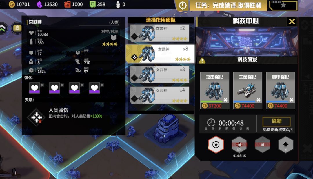 还有等我们有了四队女武神之后,我们要把一堆转其他超武(因为还有一堆可以通过召唤触发。),和其余两队用万能卡转成两个不同的轻武来触发医者的加成。然后科技天赋就根据对面的兵来上。