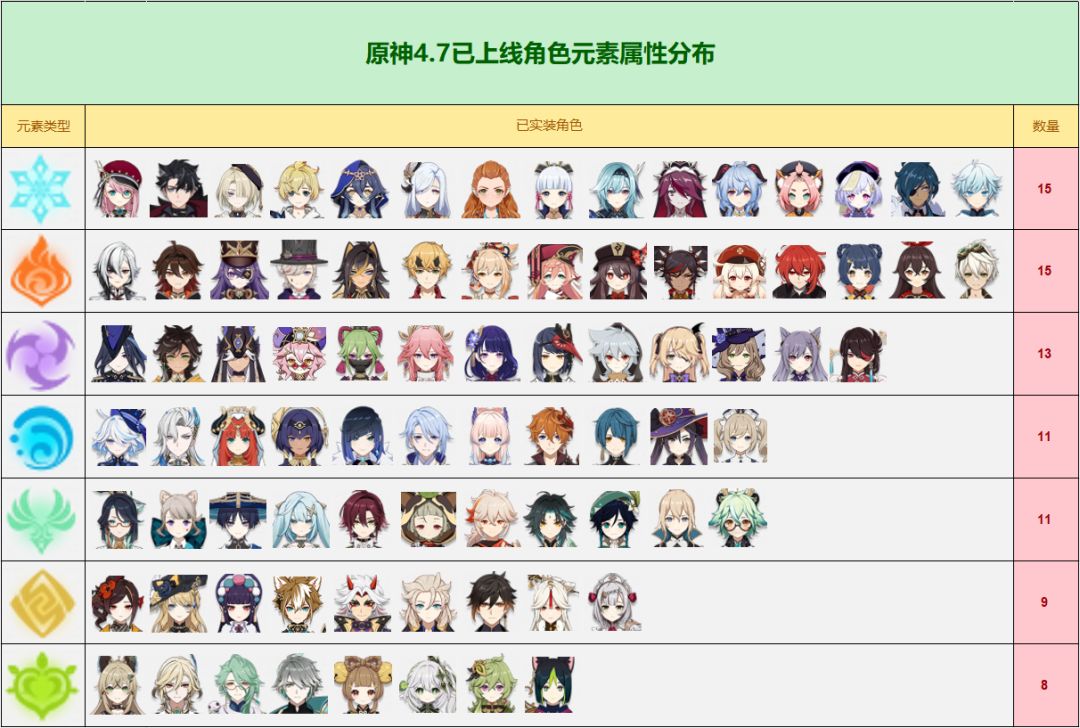 下图是截至目前4.7版本,已上线角色的元素属性分布情况: