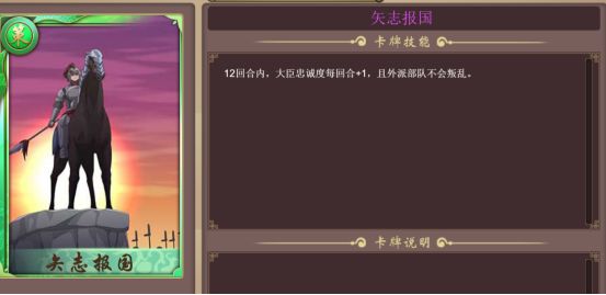 除了每回合增加忠诚度,在高难度模式下,外派部队不会叛乱是一个非常强力的buff。某些将领高野心,在高难度下容易外出叛乱,而使用了这张卡后,12回合可以防止叛乱,大大地提高了对这些将领的利用率。