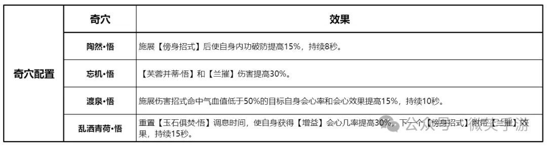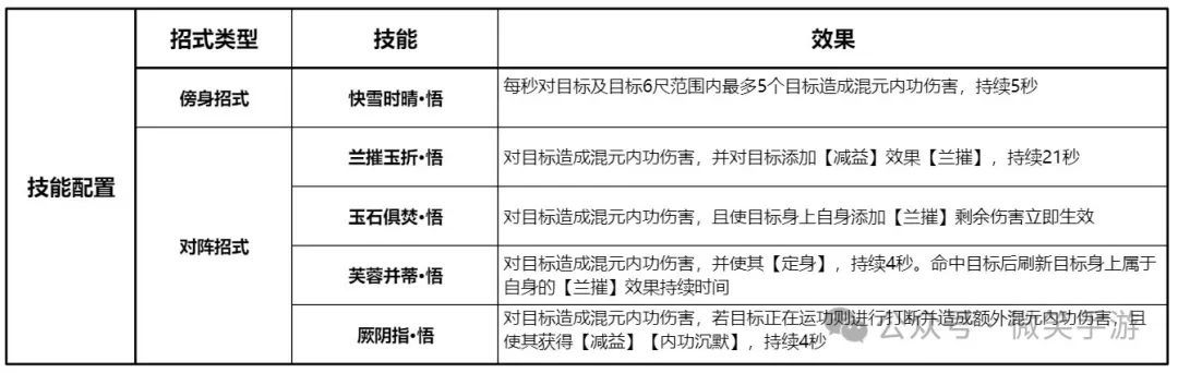 2、技能配置:PVE输出推荐携带快雪时晴,兰摧玉折,玉石俱焚,芙蓉并蒂以及厥阴指。