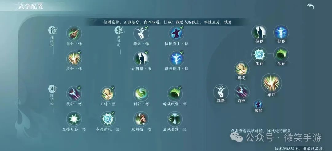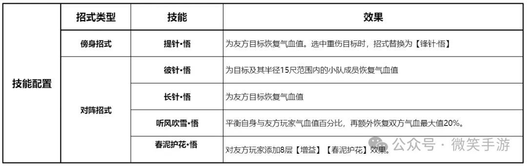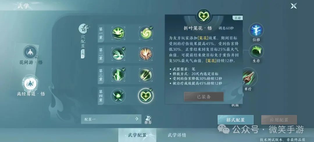 2、技能配置万花的治疗相比于其他奶妈职业来说复杂一些,万花的单体治疗和保T能力是当前所有治疗门派中最强的,但如果选择的技能和秘籍不同,在不同手法下,万花也可以进行群加。 群加选择(群奶路线)(1)技能群加技能选择提针、彼针、长针、听风吹雪以及春泥护花。