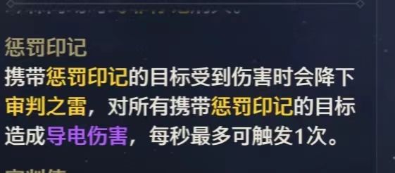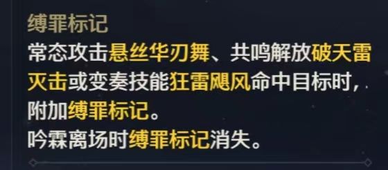 受到此buff影响的敌人,每次受到攻击会受到一个倍率约58%的审判之雷的追加伤害,每秒钟至多触发一次。这是持续性buff,经实际测试固定18秒钟,这个在技能介绍中甚至没有写。吟霖下场也不会消失(而缚罪buff是会消失的),此buff成为了所谓后台输出的全部伤害来源。