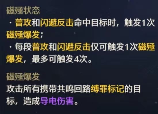 在这种强化状态下,吟霖的普通攻击和闪避反击可以触发“磁殛爆发”,每个吃到缚罪buff的敌人会受到最多四次这个磁爆的伤害。