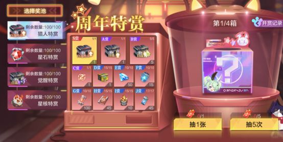 2周年庆典期间,指挥官可前往【周年特赏】中参与活动,指挥官参与急速狂飙、周年试炼等玩法中获得周年特赏券,使用周年特赏券参与抽奖,可获得自选传奇猎人、龙腾星核、冰魂觉醒材料自选等豪华奖励!还可获得周年庆头衔、称号、头像框等专属外显奖励!欢迎指挥官前往参与!