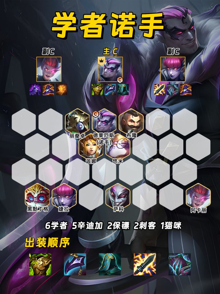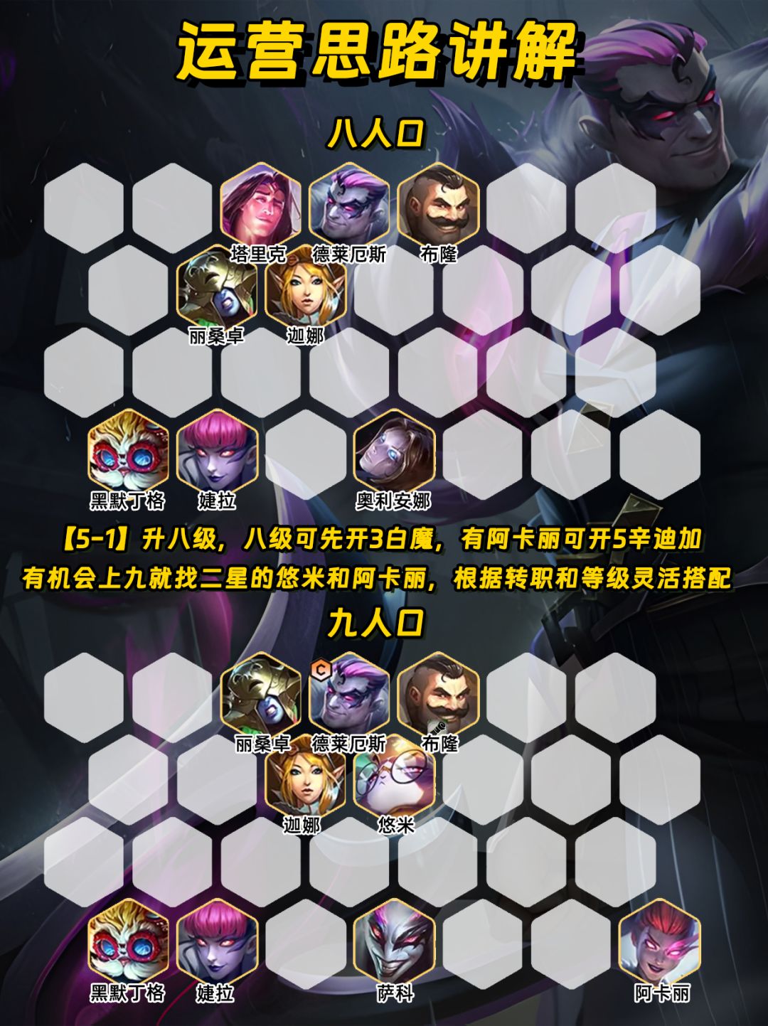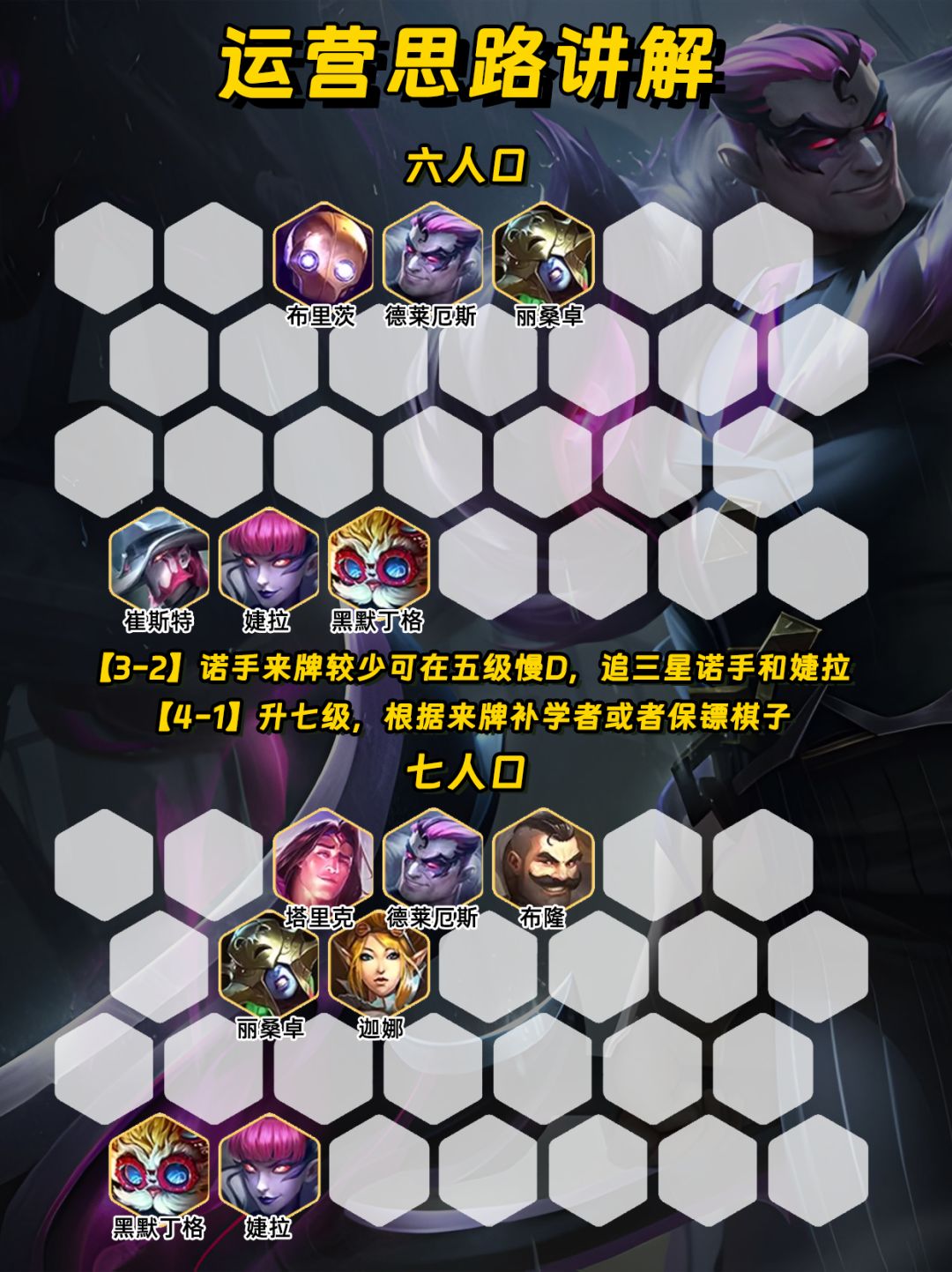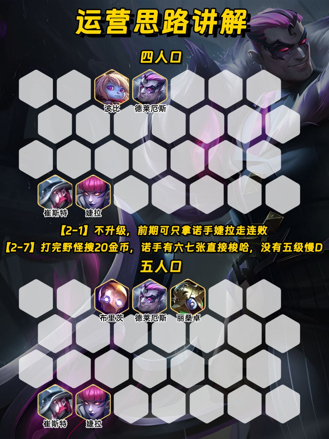 没有的话根据来牌开3白魔(补塔里克、发条)或、4保镖(补机器人、蕾欧娜)或5辛迪加(补小丑、阿卡丽)