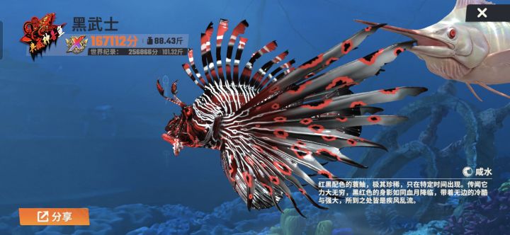 我的方法是,去鱼相册将衰轴换成红色的,再点下黑武士,再去刷个V大体型buff,直接一杆1体力钓到。