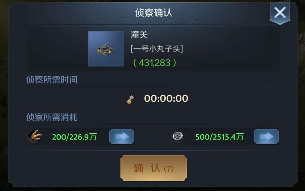 看完城池奖励后,我们就可以对该城池进行侦察啦,点击侦察后会出现侦察确认,上面显示了侦察所需时间和所需消耗的资源,确认后会派出斥候对该城池进行侦察,侦察结果可通过邮件-报告查看。