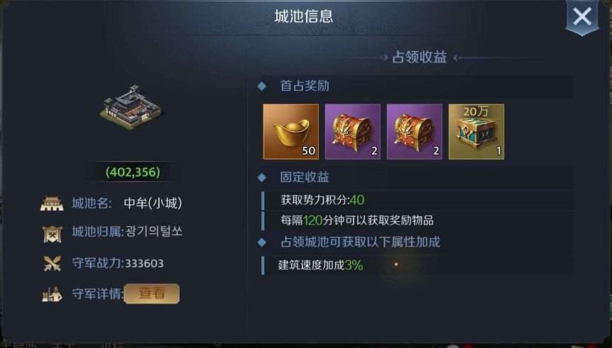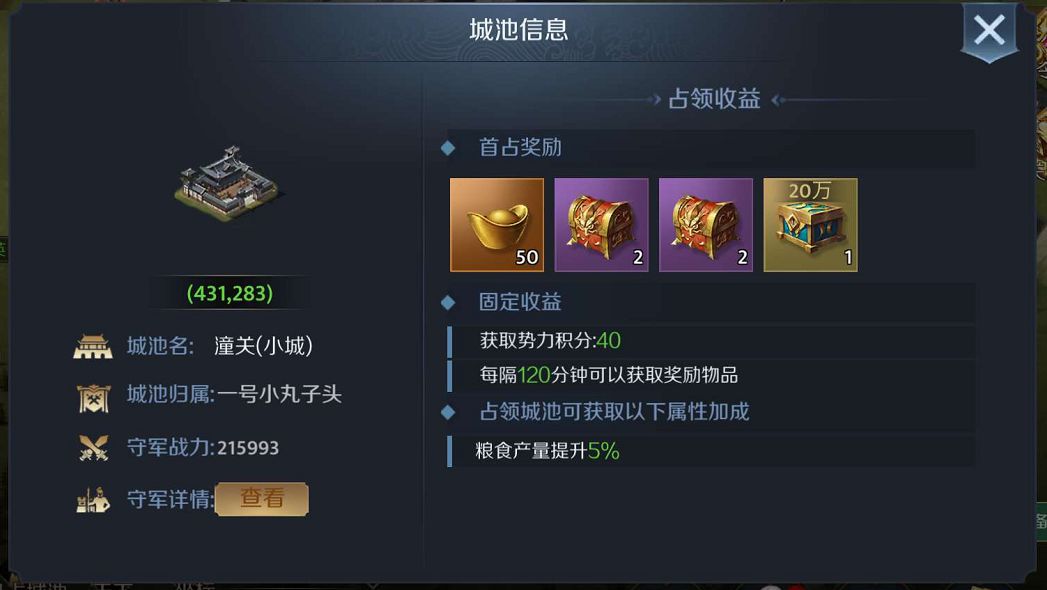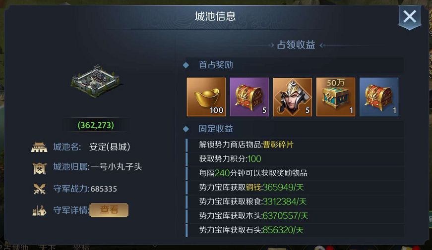 我们可以先点击信息,查看该小城情况,包含两大部分:该城池基本信息和占领收益。城池信息我们可以主要查看守军战力,以此根据自身实力判断是否可以战胜;占领收益则包括首占奖励,固定收益,还有占领该城池可以获得的属性加成。