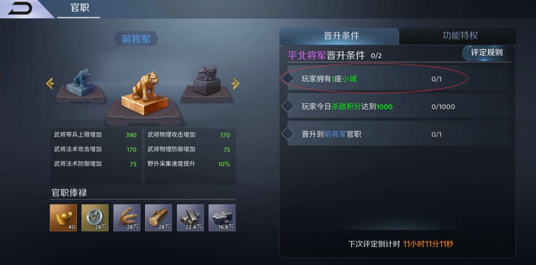 当确认我们可以战胜后,就可以出征对其进行攻打啦,为节省队伍出征时间,可以将城池迁移到小城旁边哦。 注:攻打小城官职需达到后将军,攻打县城需达到前将军,所以我们要先提升官职;同时想要完成“初始四英”中的部分任务和部分官职的提升也是需要攻占小城和县城的,且完成该任务需要当前占领,之前占领过但现在没有占领的不算在内哦。