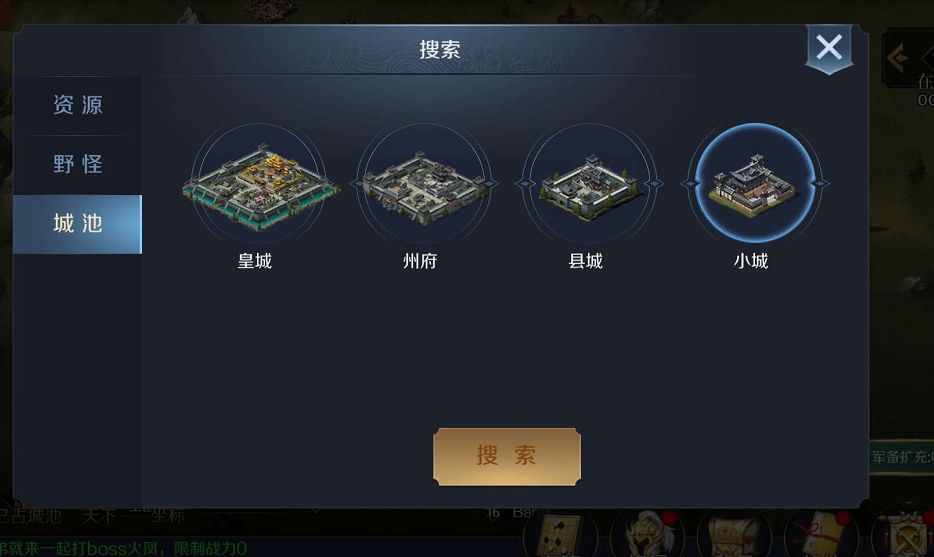 以小城为例:我们可以打开左下角的搜索按钮,选择城池-小城-搜索,将会出来各个小城的名称、坐标以及拥有者,点击一座小城前往就可以到达啦。