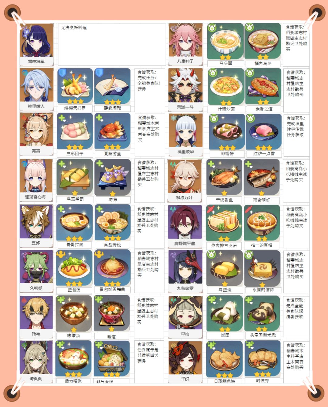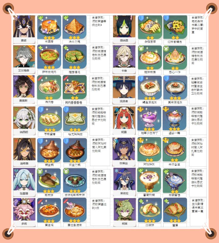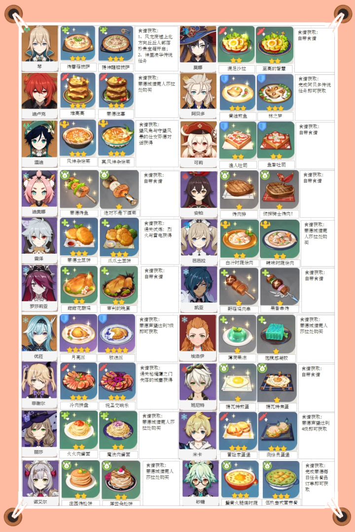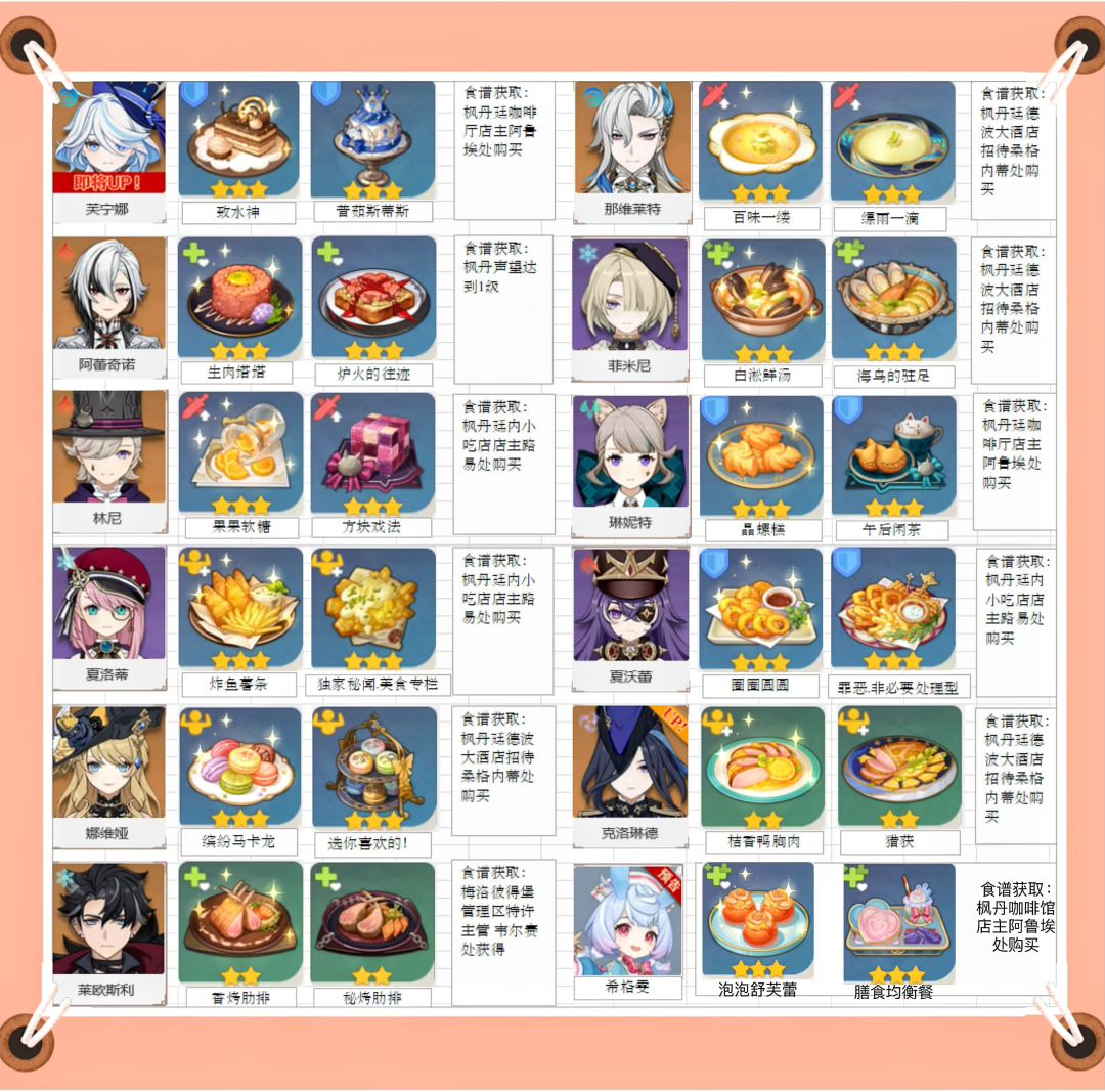 前五为当前所有已出角色特色料理汇总以及相关食谱获取方式,后三幅图为蒙德、璃月、稻妻、须弥和枫丹食谱购买处,其中,蒙德温迪的食谱并非购买获得,只需与图中npc对话即可获取。除图中为购买食谱和对话获取外,其余食谱均为任务声望获取。
