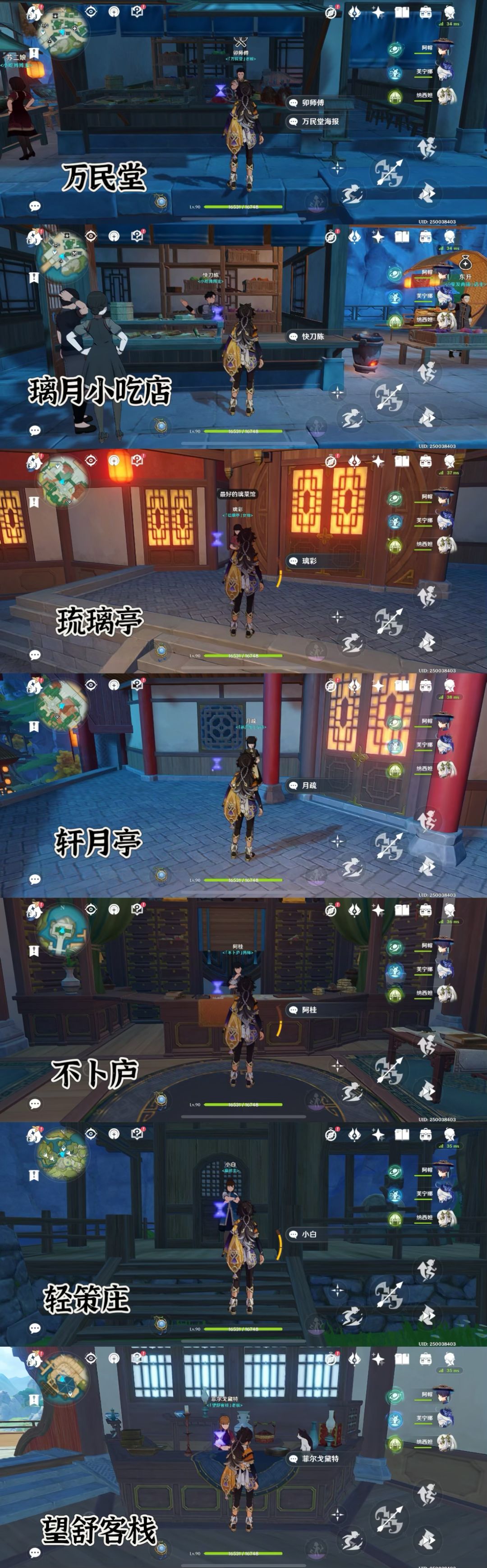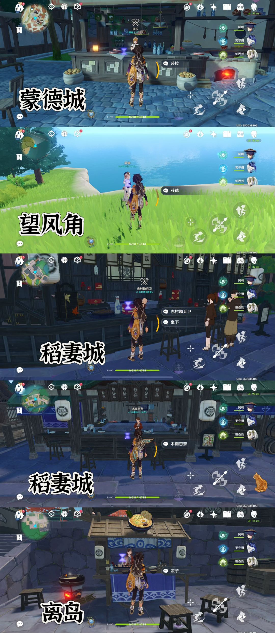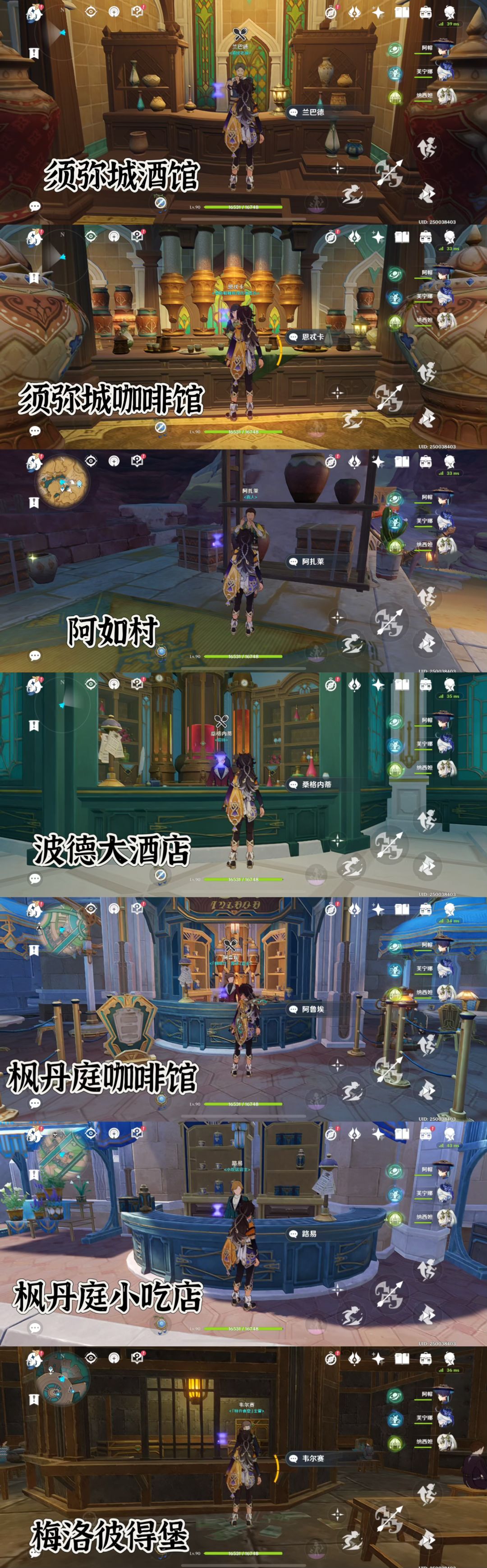 前五为当前所有已出角色特色料理汇总以及相关食谱获取方式,后三幅图为蒙德、璃月、稻妻、须弥和枫丹食谱购买处,其中,蒙德温迪的食谱并非购买获得,只需与图中npc对话即可获取。除图中为购买食谱和对话获取外,其余食谱均为任务声望获取。