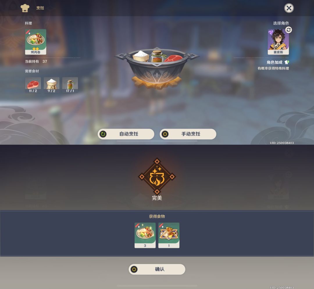 同时,须注意,料理的制作并非50%即可获取特殊料理,概率仅为10%左右,即需要获得足够的食材制作方可制作成功。同时,需注意‼️获取特殊料理的方式必须由对应的角色来制作才可获得。