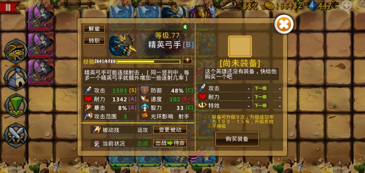 精英弓:抓攻击 暴击和速度高的被动技能远攻,或者幸运都可以。初始1-7就有。装备可以上银弩