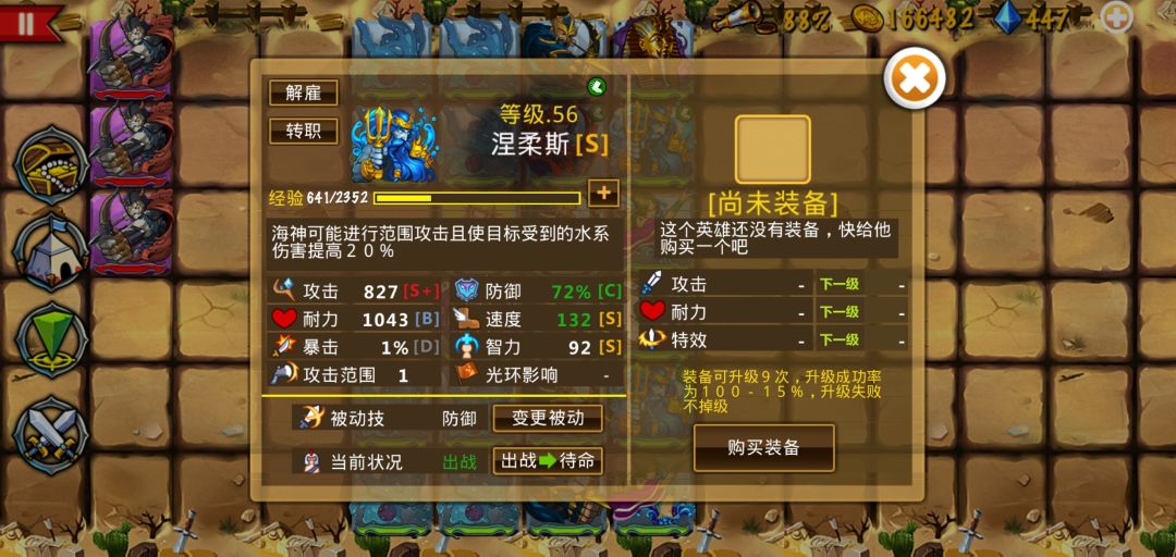 海神:早期最好找一个速度高的没有被动还便宜。如果想要好一点的,可以兼顾一下速度和被动,有被动的后面洗成财富还可以刷钻石。后期的话血量攻击防御速度被动都比较有用,不强求。2-54出。装备可以上索尔鞋,但是有湖仙加速基本用不上