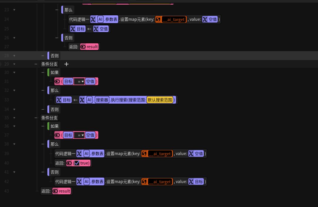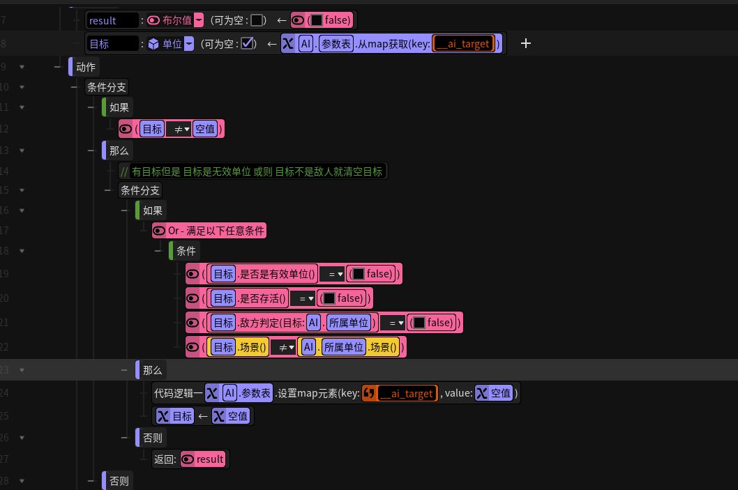 3.1先判断目标单位是否为空,有目标但是目标是无效单位 或则 目标不是敌人就清空目标。目标不为空且是有效单位等,就跳过这个AI行为表逻辑。执行下一个AI行为表。当目标为空的时候,