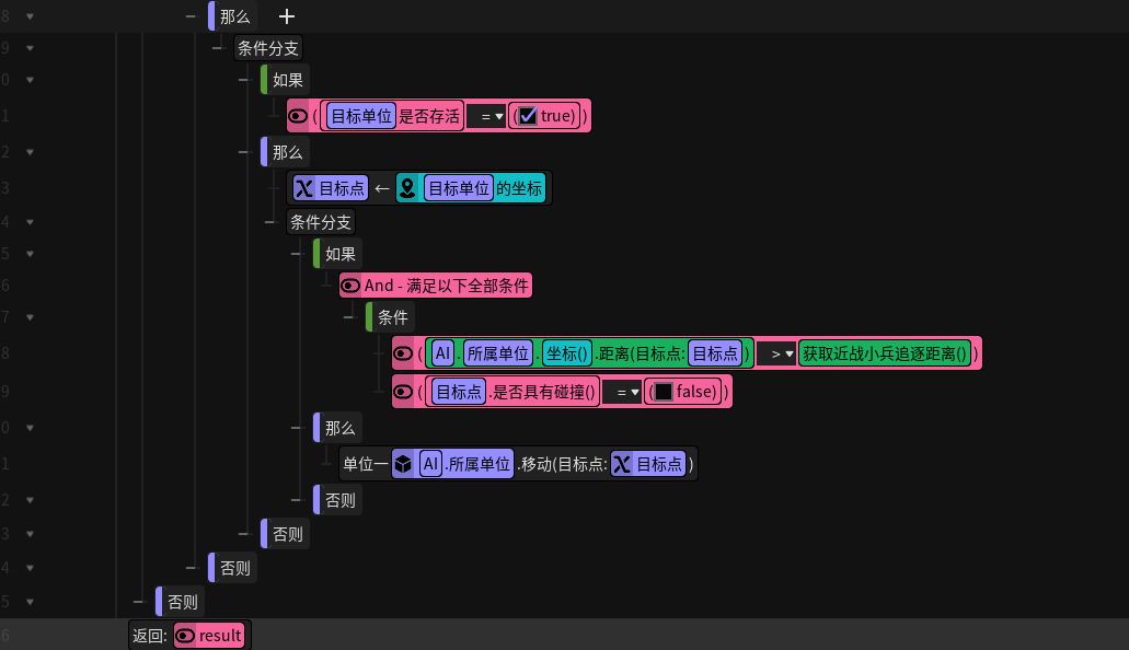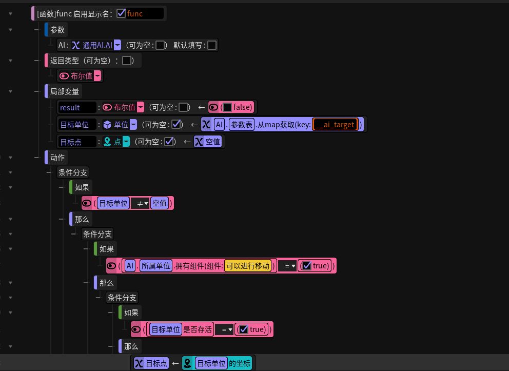 2战斗中移动:这个复制官方的修改一下。先将当前单位锁定的敌人赋予目标单位,然后进行一系列判断 目标单位是否不为空、AI单位是否可以移动、目标单位是否存活。