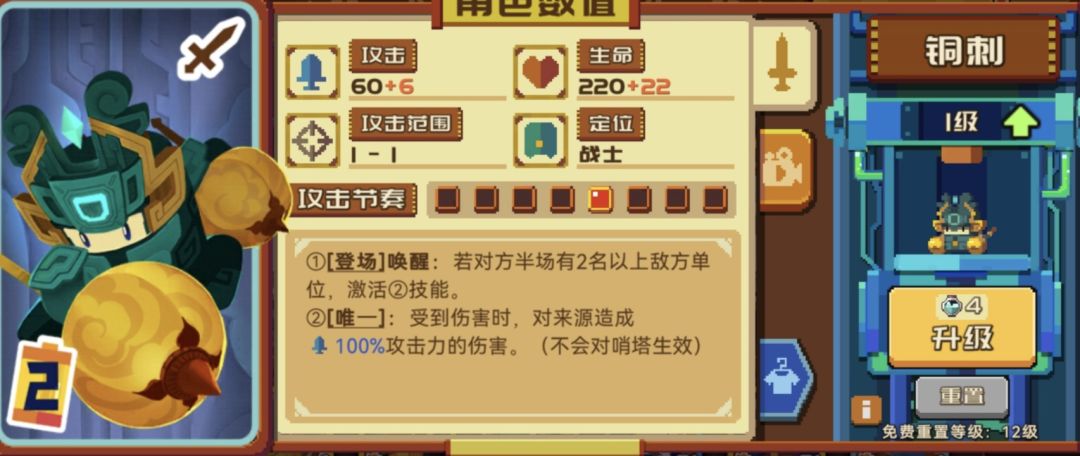 铜刺身材60/220在两费战士之中只有小恶魔的面板可以与其抗争。效果反伤可以一定程度上限制射手,也算是不错的一张卡,但是功能过于朴素,实战上场堪忧。