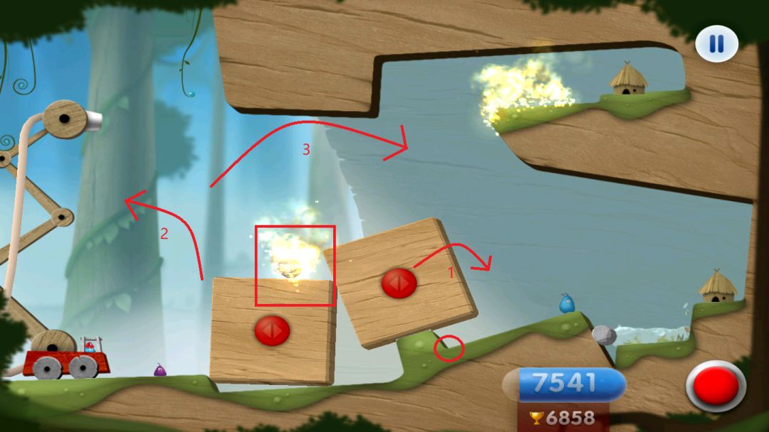 开局先不要动这两个箱子,将水沿红色轨迹冲至7500左右水量,这些水刚好够把现有的火和之后坠落的陨石一并浇灭。