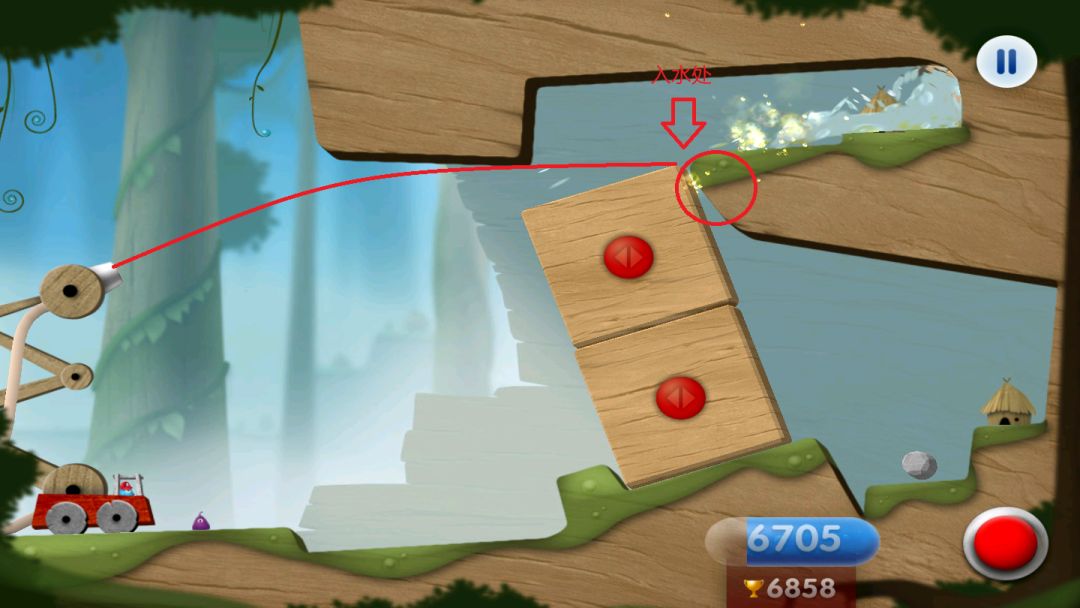 摆放好箱子后,由于只要保持5000水量即可五星过关,我们可以保险地沿红线喷水至6000水量值。如果红圈处火焰灭不掉的话,可以把上面的箱子拿开直接浇灭。或者使用一个小技巧,将上面的箱子向左挪一点,漏出一个小缝隙,将流下来的水从图中的‘’入水处‘’放进缝隙灭火。